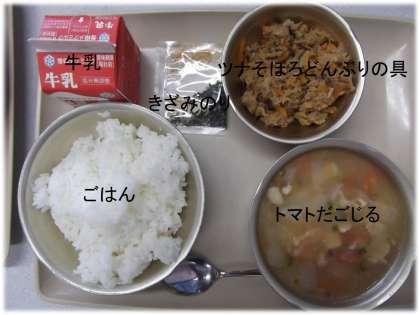 「ごはん」「トマトだごじる」「ツナそぼろどんぶりの具」