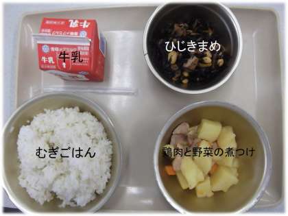 「むぎごはん」「鶏肉と野菜の煮つけ」「ひじきまめ」「牛乳」