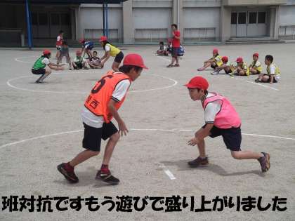 体育の時間に「すもうあそび」をして盛り上がりました。班対抗でリーグ戦で戦います。いつも以上に応援する声も大きく熱戦をくりひろげていました。中には勝負がつかず,引き分け試合もありました。
