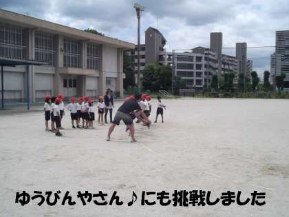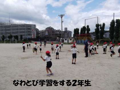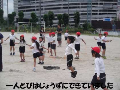 まずは,自分ができる一人とびの練習をして,クラスに分かれて大なわとびに挑戦です。一人とびはみんなじょうずにできていたのですが,大なわで「ゆうびんやさん♪・・・」をはじめると,なかなかとべませんでした。多くて2〜3回だったので,これから練習をつんでいきたいと思います。