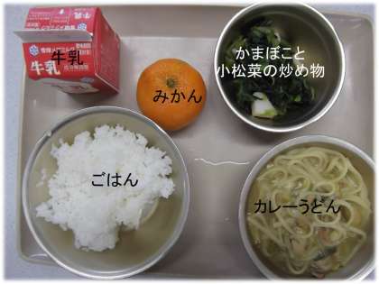 「ごはん」「カレーうどん」「かまぼこと小松菜の炒め物」
