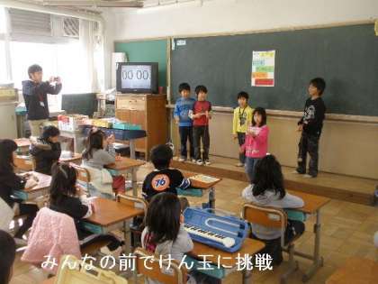 参観授業は1組も2組も発表会をしました。けん玉がものすごく上手になっていました。