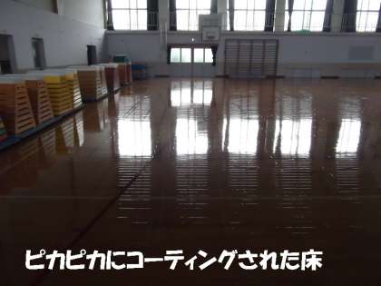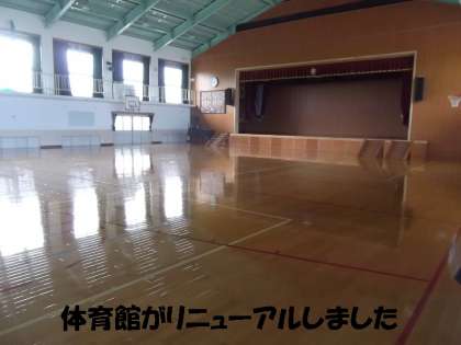昨日,体育館の床(フロア)を樹脂コーティング加工してもらいました。ピカピカにリニューアルしました。鏡のように光っていますが,運動がしやすいように滑り止め加工もされています。