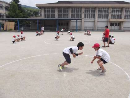 5年生は,体育の授業で「すもうあそび」の学習をしています。運動場では,熱戦が繰り広げられています。応援している人も取組に負けないあつい応援をしていました。