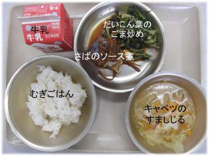 「むぎごはん」「キャベツのすましじる」「さばのソース煮」