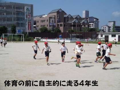 朝一番に元気に運動場に飛び出してきました。先生が来るまでに,自分たちで自主的に運動場を3周走って準備運動ができる4年生です。