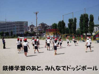 今日は鉄棒で「足かけまわり」を練習をしたあと,みんなで楽しくドッジボールをしました。