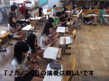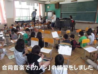 合同音楽でリコーダー練習をしました。曲名は,有名なリコーダー曲「カノン」です。毎年6年生が挑戦している難しい曲です。