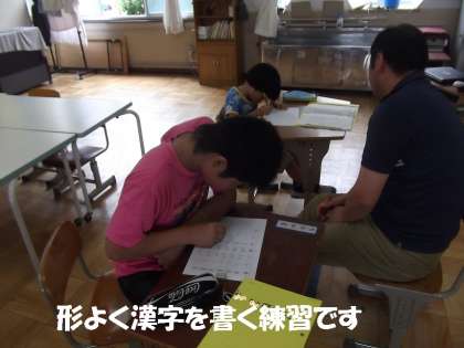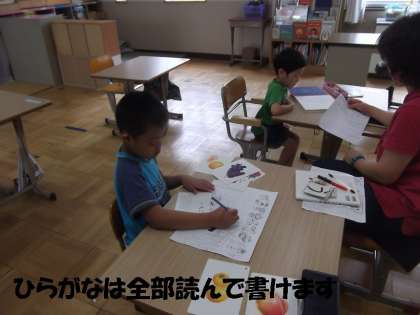低学年の2人は,ひらがなの読み書きがしっかりできます。「ん」の使い方や「み」「も」などのつく言葉をプリントに書いていました。
