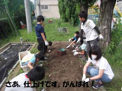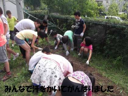 5年生全員で汗水たらして,5時間目にがんばりました。このあと,マルチシートをはって,ミニトマト,スイカ,ナス,ピーマン等の第2期の苗を植えつけます。