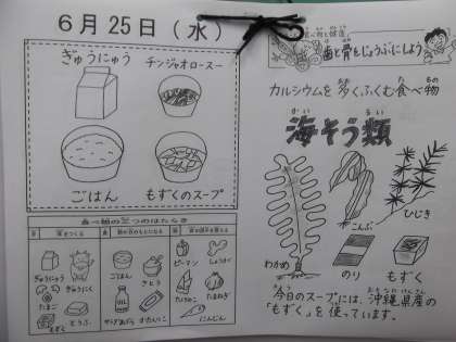 今日のスープには,沖縄県産の「もずく」が使われています。