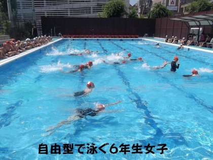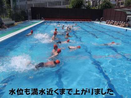 最初にプール内を走ってまわり,次に自由な泳法で泳いでまわりました。きれいなうずができました。