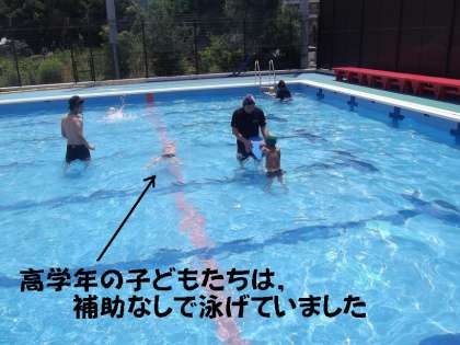 高学年のあとに,水位を下げて3組さんがプールに入りました。