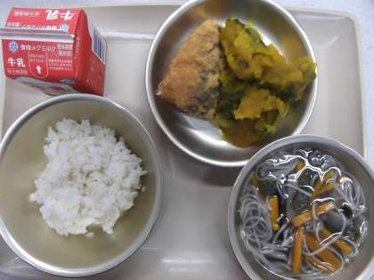 今日の給食の献立は,「むぎごはん」 「たなばたそうめん」 「さばのたつたあげ」 「かぼちゃのにつけ」 「牛乳」です。