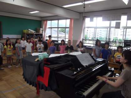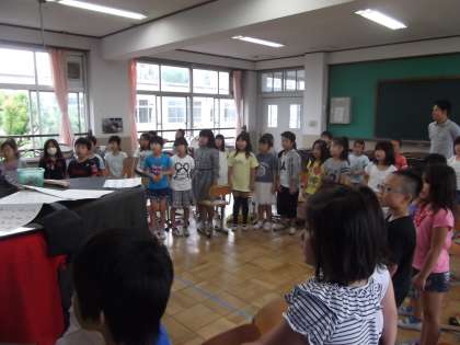 音楽の授業で,「森へ森へ」の歌の練習をしていました。校舎に3年生の元気な歌声が響いていました。