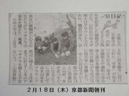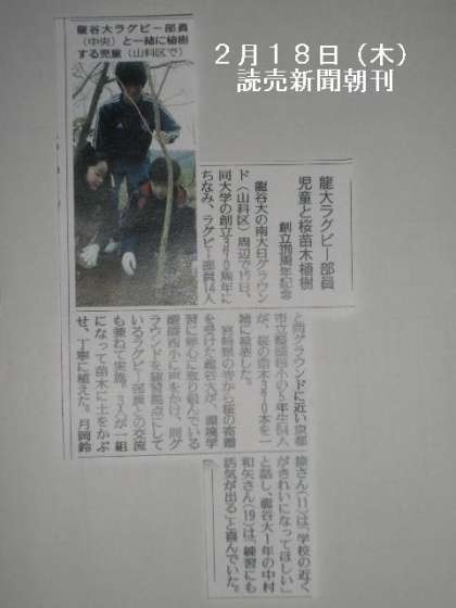 昨日の「龍谷大学創立370周年記念植樹」に本校の5年生が招かれ,学生さんたちと一緒に植樹をさせていただいたり,そのあとの交流会で遊ばせてもらった様子が,昨日夕方にKBS京都で放映されました。そして本日の京都新聞と読売新聞の朝刊にその様子が掲載されています。是非ごらんください。