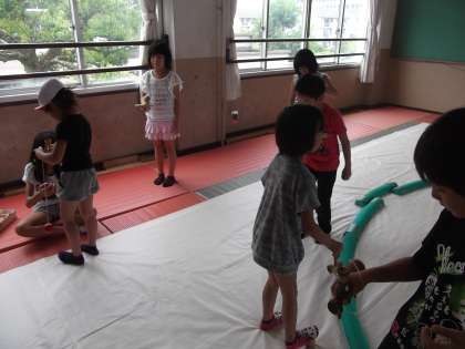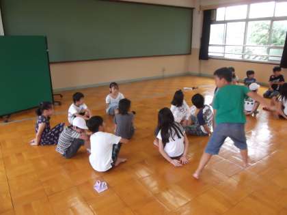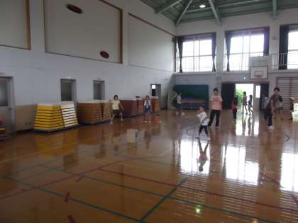 体育館では,「ドッジビー」「あておに」などをして遊んでいました。みんな上手にボールやフリスビーを避けたり,キャッチしたりしていました。相撲場では,「ビンゴ」「けんだま」をして遊んでいました。多目的室では,「ハンカチ落とし」をして楽しんでいました。