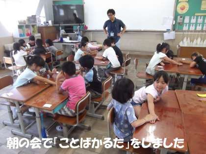 本校では,朝の会で語彙力を増やす取組を入れています。今日の2年生では,専科の先生に入ってもらって,「ことばかるた」をして楽しんで語彙力を増やしていました。