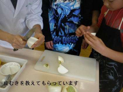 午後からは1組が実習しました。かぶらの皮むきに四苦八苦しながらも,おいしいだしで炊いて作りました。試食会では,「おいしい,おいしい」の連発で,かぶらを炊いたあとのだしも,まったく鍋に残ることなく平らげてしまいました。