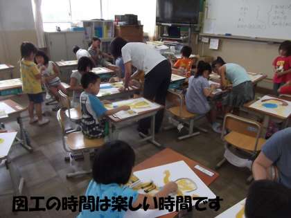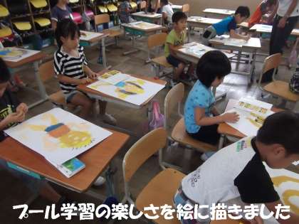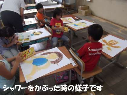 図工の時間に,楽しいプール学習の絵を描いています。「わーい,シャワーだ!」というテーマで気持ちよさそうにシャワーをかぶっているところの絵です。