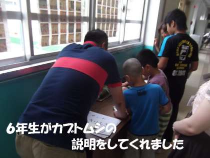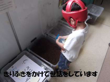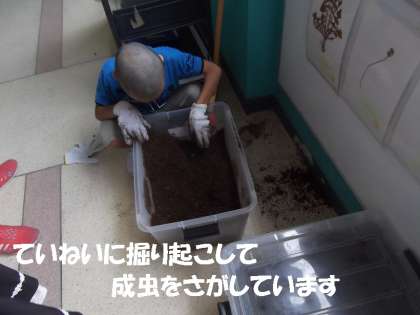 今朝かえったカブトムシ数匹を飼育箱に移しました。カブトムシ博士の6年生がみんなにカブトムシの成虫のことを詳しく教えていました。
