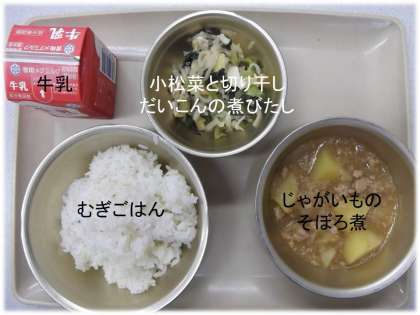 「小松菜と切り干しだいこんの煮びたし」「牛乳」
