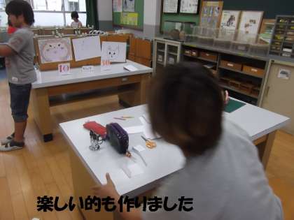 見本を見ながら意欲的に作り,輪ゴムをひっかけて的当てゲームをして楽しみました。
