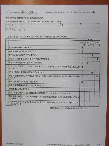 ○楽しく学校へ通えていますか?○自分からあいさつできますか?○友だちとなかよくすごせていますか?・・・等々,14項目の設問に答えていました。