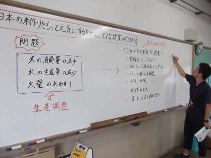 社会科の授業では,「わたしたちの生活と食料生産」の単元を学習しています。今日の授業は,これからの米作りについて考えていました。
