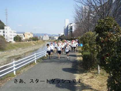 今日,3〜4校時に山科川河川敷まで行き,持久走大会で走るコースを試走しました。運動場を何回も回っているよりも気持ちよく走れましたが,さすがに1500メートルは長い距離ですので,スタートダッシュで飛び出した子どもより,常に同じペースで走った子どもの方が記録は良かったようです。