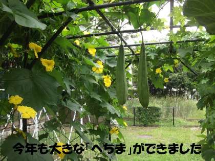 今年も学習園にへちまが鈴なりに育っています。大人の腕ぐらいの大きさのへちまが10〜15ぐらいぶら下がっています。