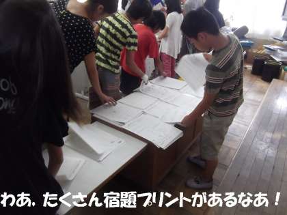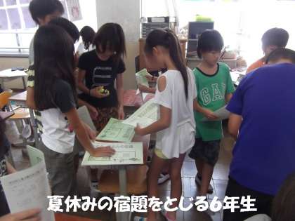 夏休みの宿題プリントが刷り上がったので,みんなで手分けしてとじました。