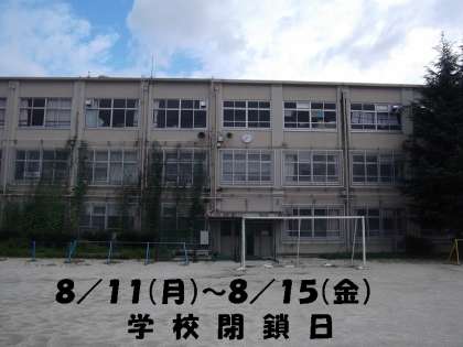 本日8/11(月)から8/15(金)まで,京都市立学校は閉鎖されます。教職員は出勤しておりません。ご迷惑をおかけしますが,よろしくお願いします。