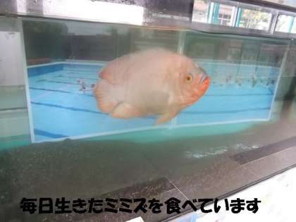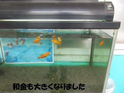 保健室前の魚たちも元気です。大型熱帯魚のオスカーは,毎日生きたミミズを1匹食べています。金魚(和金)もミネラル,ビタミン入りのえさを食べて,ずいぶん大きくなりました。