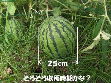 そろそろ収穫時期をむかえているように思いますが,たたいてみて,まだ高い音がしますので,もう少し待とうかと迷っています。????どなたかすいかの収穫時期をご存じの方はおられませんか???
