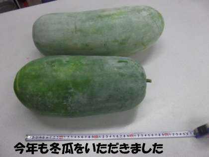 今年も中山保育園の前園長先生から,大きな「冬瓜(とうがん)」をいただきました。毎年,5年生の長期宿泊・自然体験学習・5泊6日に持って行って,5日目の「野外パーティー」の時に「冬瓜スープ」を作っています。
