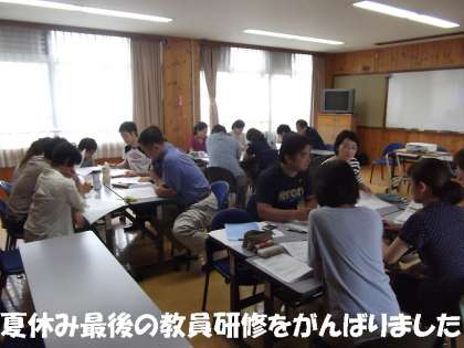 午後2時から,先生たちは夏休み最後の研修会にのぞんでいます。低・中・高学年に分かれて子どもたちへの個別の指導法・指導計画・指導評価等を意見交流しています。