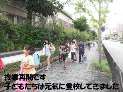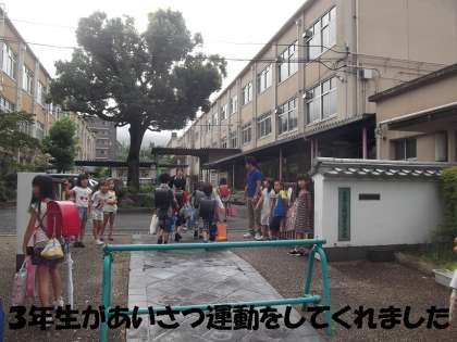 授業再開です。子どもたちは笑顔で元気に登校してきました。3年生が初日から正門前に並んで,朝のあいさつをしてくれました。