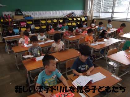1年生は,これから後期にかけて学習する「漢字ドリル」を配ってもらいました。さっそく中を開けて先生の説明を聞いていました。