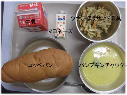 「コッペパン」「パンプキンチャウダー」「ツナごぼうサラダの具」