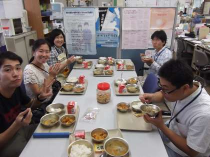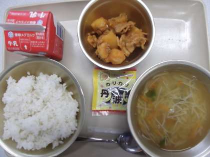 今日の給食の献立は,「むきごはん」「ビーフンスープ」「ぶたにくのケチャプに」「牛乳」「くろだいず」全部おいしくいただくことができました。ごちそうさまでした。