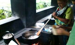 カレー作り続編。かまどに火をおこし,野菜を上手に切り,それをただ今炒めています。