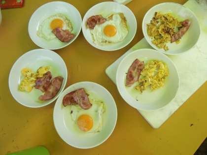 昨日より火付けも早くなり,時間内に朝食が終わりました。今日のモットーの「工夫」を意識して取り組めていました。