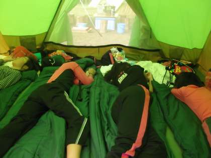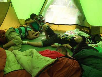 でも,あまり寝なかったようで,テント内をのぞくと「うそ寝」をしていました。