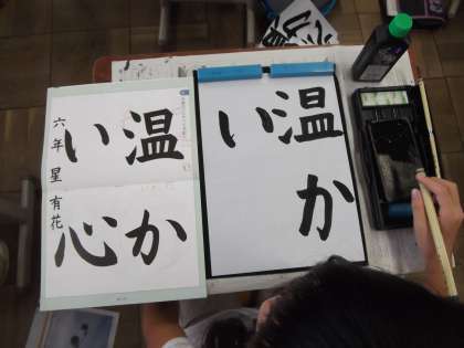 6年2組では、習字の時間に「温かい心」を一画一画,集中して字の練習をしていました。教室は張りつめた空気が漂っていました。