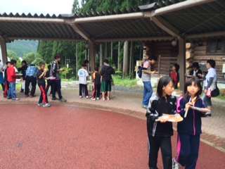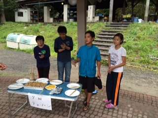 バイキング形式なので各班の料理を取りに行っています。どの班もとても美味しそうです。