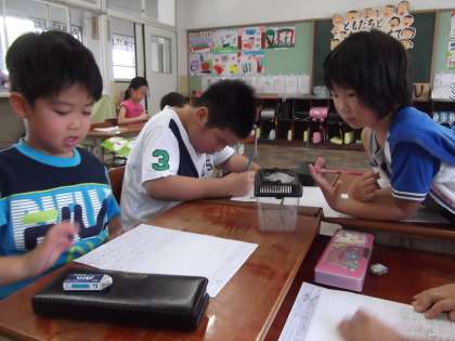 2年2組では.,生活科の時間にビオトープで捕まえた虫をよく観察してスケッチしていました。