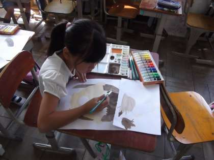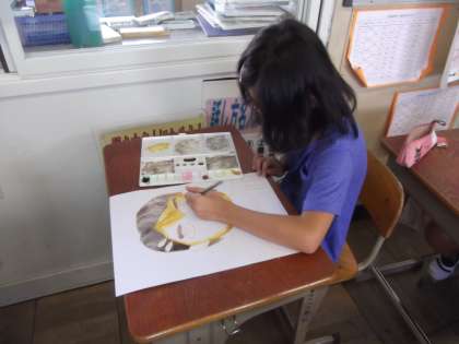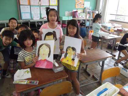 図工の時間に自分の顔を鏡で見ながら描いていました。自分の顔の特徴をよくとらえていました。