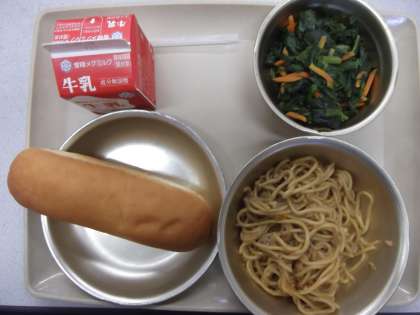 今日の給食の献立は,「こがたコッペパン」「坦々麺」「ほうれんそうのいためもの」