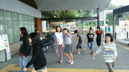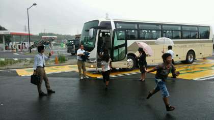 9時20分トイレ休憩御在所SAに到着。車中では,バスレクで大いに盛り上がっています。今井・門別先生が罰ゲームで歌を歌わされました。